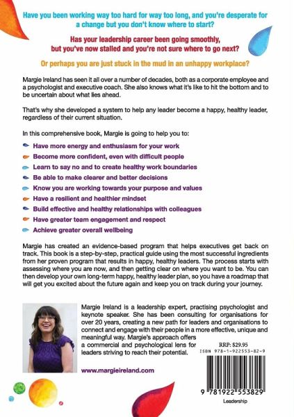 Have you been working way too hard for way too long, and you're desperate for a change but you don't know where to start? Has your leadership career being going smoothly, but you've now stalled and you're not sure where to go next? Or perhaps you are just stuck in the mud in an unhappy workplace? Margie Ireland has seen it all over a number of decades, both as a corporate employee and a psychologist and executive coach. She also knows what it's like to hit the bottom and to be uncertain about what lies ahead. That's why she developed a system to help any leader become a happy, healthy leader, regardless of their current situation. In this comprehensive book, Margie is going to help you to:Have more energy and enthusiasm for your work Become more confident, even with difficult people Learn to say no and to create healthy work boundaries Be able to make clearer and better decisions Know you are working towards your purpose and values Have a resilient and healthier mindset Build effective and healthy relationships with colleagues Have greater team engagement and respect Achieve greater overall wellbeing Margie has created an evidence-based program that helps executives get back on track. This book is a step-by-step, practical guide using the most successful ingredients from her proven program that results in happy, healthy leaders. The process starts with assessing where you are now, and then getting clear on where you want to be. You can then develop your own long-term happy, healthy leader plan, so you have a roadmap that will get you excited about the future again and keep you on track during your journey.