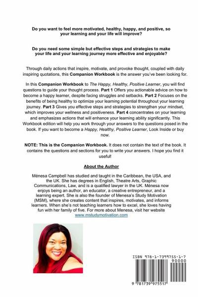 Do you want to feel more motivated, healthy, happy, and positive, so your learning and your life will improve? Do you need some simple but effective steps and strategies to make your life and your learning journey more effective and enjoyable? If you answered "YES!" to any of the above questions, then this COMPANION WORKBOOK is just for you. Through daily actions that inspire, motivate, and provoke thought, coupled with daily inspiring quotations, this Companion Workbook is the answer you've been looking for. In this Companion Workbook to The Happy, Healthy, Positive Learner, you will find questions to guide your thought process. Part 1 Offers you actionable advice on how to become a happy learner, despite facing struggles and setbacks. Part 2 Focuses on the benefits of being healthy to optimize your learning potential throughout your learning journey. Part 3 Gives you effective steps and strategies to strengthen your mindset, which improves your wellness and positiveness. Part 4 concentrates on your learning and emphasizes actions that will enhance your learning ability significantly. This Workbook edition will help you work through your answers to the questions posed in the book. If you want to become a Happy, Healthy, Positive Learner, Buy Now! NOTE: This is the Companion Workbook. It does not contain the text of the book. It contains the questions and sections for you to write your answers. I hope you find it useful!