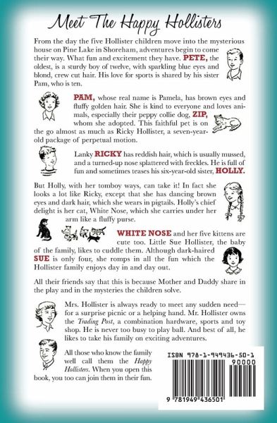 The Happy Hollisters by Jerry West was actually written by Andrew E. Svenson, a prolific yet somewhat anonymous, writer of books for children. Jerry West was the pen name Svenson used when he started writing The Happy Hollisters for the Stratemeyer Syndicate. The Stratemeyer Syndicate was a book packager, well-known for its development of children's book series including Tom Swift, The Bobbsey Twins, The Hardy Boys, and Nancy Drew. Many of these series were intended to have long publishing lives, and were written by multiple authors using the same pseudonym. The Happy Hollisters, however, were all written by Andrew Svenson, whose identity as Jerry West was kept secret until several years after his death in 1975. Andrew Svenson was born in Belleville, NJ, in 1910, and his interest in writing started early. He was editor of his high school newspaper and yearbook at Barringer High School in Newark, and then went on to study Creative Writing at the University of Pittsburgh. After his graduation in 1932, he worked as a reporter and editor for the Newark Star Eagle and the Newark Evening News. He also taught creative writing courses at Rutgers University and Upsala College. Andrew Svenson was encouraged by his friend Howard Garis (author of Uncle Wiggily) to try his hand at juvenile fiction. He joined the Stratemeyer Syndicate as a writer in 1948, where he contributed to established series as Franklin W. Dixon (The Hardy Boys) and as Laura Lee Hope (The Bobbsey Twins). The first volume in his own original series, The Happy Hollisters, was published in 1953 by Doubleday & Company, and he was made a partner in the Stratemeyer Syndicate in 1961. As he wrote and developed 33 titles in The Happy Hollisters, he was also creating additional series for children under other pen names: Bret King by Dan Scott and The Tollivers by Alan Stone, one of the first series written about and for African-American children. Under various pseudonyms, Andrew Svenson wrote more than 80 adventure and mystery novels for children, which were published in 17 languages and sold millions of copies. The Hollister family was modeled on his own family and he often used actual Svenson family events and travels as the foundation for The Happy Hollisters books. He also kept copious newspaper clippings for story ideas, and interviewed hundreds of school children and teachers for additional suggestions. These ideas were then worked into his storylines, adding an educational element that was appreciated by parents and educators alike. The children loved the stories for their elements of danger and excitement geared to their comprehension level. After his death in 1975, the Stratemeyer Syndicate assigned all rights to The Happy Hollisters to his widow, Marian Svenson; they subsequently became the property of The Hollister Family Properties Trust. The current publication was initiated by Andrew E. Svenson III, grandson of the author, on behalf of The Hollister Family Properties Trust.