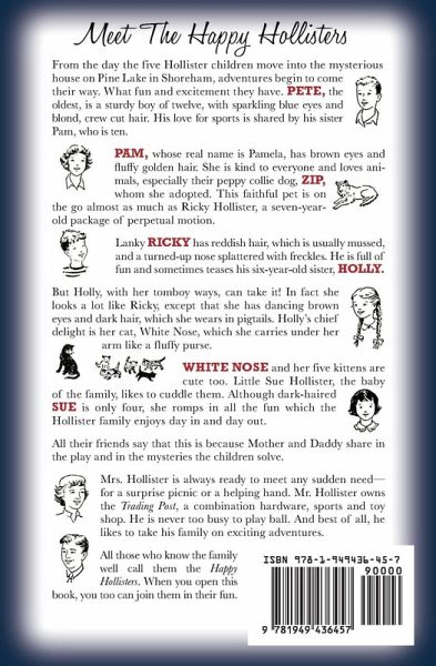 The Happy Hollisters by Jerry West was actually written by Andrew E. Svenson, a prolific yet somewhat anonymous, writer of books for children. Jerry West was the pen name Svenson used when he started writing The Happy Hollisters for the Stratemeyer Syndicate. The Stratemeyer Syndicate was a book packager, well-known for its development of children's book series including Tom Swift, The Bobbsey Twins, The Hardy Boys, and Nancy Drew. Many of these series were intended to have long publishing lives, and were written by multiple authors using the same pseudonym. The Happy Hollisters, however, were all written by Andrew Svenson, whose identity as Jerry West was kept secret until several years after his death in 1975. Andrew Svenson was born in Belleville, NJ, in 1910, and his interest in writing started early. He was editor of his high school newspaper and yearbook at Barringer High School in Newark, and then went on to study Creative Writing at the University of Pittsburgh. After his graduation in 1932, he worked as a reporter and editor for the Newark Star Eagle and the Newark Evening News. He also taught creative writing courses at Rutgers University and Upsala College. Andrew Svenson was encouraged by his friend Howard Garis (author of Uncle Wiggily) to try his hand at juvenile fiction. He joined the Stratemeyer Syndicate as a writer in 1948, where he contributed to established series as Franklin W. Dixon (The Hardy Boys) and as Laura Lee Hope (The Bobbsey Twins). The first volume in his own original series, The Happy Hollisters, was published in 1953 by Doubleday & Company, and he was made a partner in the Stratemeyer Syndicate in 1961. As he wrote and developed 33 titles in The Happy Hollisters, he was also creating additional series for children under other pen names: Bret King by Dan Scott and The Tollivers by Alan Stone, one of the first series written about and for African-American children. Under various pseudonyms, Andrew Svenson wrote more than 80 adventure and mystery novels for children, which were published in 17 languages and sold millions of copies. The Hollister family was modeled on his own family and he often used actual Svenson family events and travels as the foundation for The Happy Hollisters books. He also kept copious newspaper clippings for story ideas, and interviewed hundreds of school children and teachers for additional suggestions. These ideas were then worked into his storylines, adding an educational element that was appreciated by parents and educators alike. The children loved the stories for their elements of danger and excitement geared to their comprehension level. After his death in 1975, the Stratemeyer Syndicate assigned all rights to The Happy Hollisters to his widow, Marian Svenson; they subsequently became the property of The Hollister Family Properties Trust. The current publication was initiated by Andrew E. Svenson III, grandson of the author, on behalf of The Hollister Family Properties Trust.
