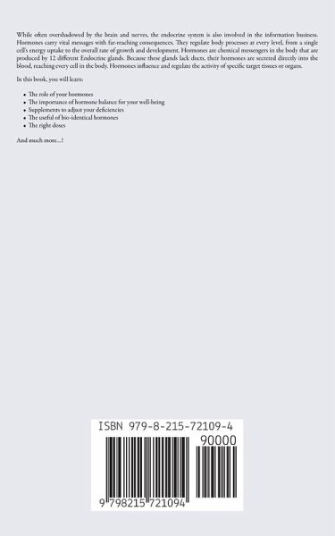 While often overshadowed by the brain and nerves, the endocrine system is also involved in the information business. Hormones carry vital messages with far-reaching consequences. They regulate body processes at every level, from a single cell's energy uptake to the overall rate of growth and development. Hormones are chemical messengers in the body that are produced by 12 different Endocrine glands. Because these glands lack ducts, their hormones are secreted directly into the blood, reaching every cell in the body. Hormones influence and regulate the activity of specific target tissues or organs. In this book, you will learn:The role of your hormones The importance of hormone balance for your well-being Supplements to adjust your deficiencies The useful of bio-identical hormones The right doses And much more...!