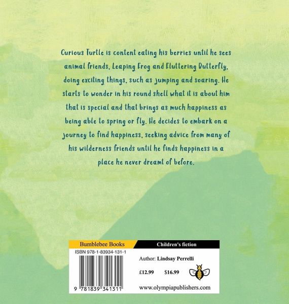 Curious Turtle is content eating his berries until he sees animal friends, Leaping Frog and Fluttering Butterfly, doing exciting things, such as jumping and soaring. He starts to wonder in his round shell what it is about him that is special and that brings as much happiness as being able to spring or fly. He decides to embark on a journey to find happiness, seeking advice from many of his wilderness friends until he finds happiness in a place he never dreamt of before.
