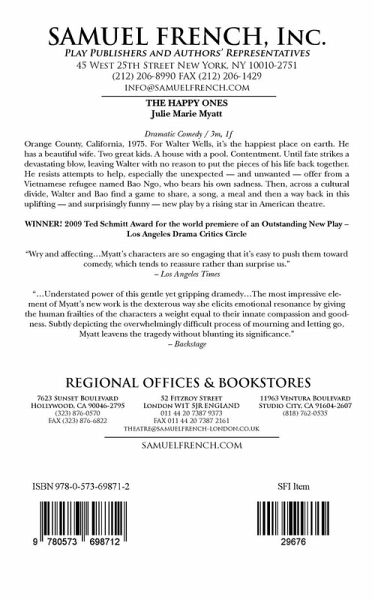 Dramatic ComedyCharacters: 3 males, 1 femalesWINNER! 2009 Ted Schmitt Award for the world premiere of an Outstanding New Play - Los Angeles Drama Critics CircleOrange County, California, 1975. For Walter Wells, it's the happiest place on earth. He has a beautiful wife. Two great kids. A house with a pool. Contentment. Until fate strikes a devastating blow, leaving Walter with no reason to put the pieces of his life back together. He resists attempts to help, especially the unexpected - and unwanted - offer from a Vietnamese refugee named Bao Ngo, who bears his own sadness. Then, across a cultural divide, Walter and Bao find a game to share, a song, a meal and then a way back in this uplifting - and surprisingly funny - new play by a rising star in American theatre. "Wry and affecting...Myatt's characters are so engaging that it's easy to push them toward comedy, which tends to reassure rather than surprise us." -Los Angeles Times..".Understated power of this gentle yet gripping dramedy...The most impressive element of Myatt's new work is the dexterous way she elicits emotional resonance by giving the human frailties of the characters a weight equal to their innate compassion and goodness. Subtly depicting the overwhelmingly difficult process of mourning and letting go, Myatt leavens the tragedy without blunting its significance." -Backstage