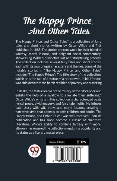 The Happy Prince, and Other Tales" is a collection of fairy tales and short stories written by Oscar Wilde and first published in 1888. The stories are renowned for their blend of whimsy, moral lessons, and poignant social commentary, showcasing Wilde's distinctive wit and storytelling process. The collection includes several fairy tales and short stories, each with its own unique characters and themes. Some of the notable stories in "The Happy Prince, and Other Tales" include: "The Happy Prince": The title story of the collection, which tells the tale of a statue of a prince who, in his lifetime, was shielded from the harsh realities of poverty and suffering. In death, the statue learns of the misery of the city's poor and enlists the help of a swallow to alleviate their suffering. "The Nightingale and the Rose": A story about a nightingale who sacrifices herself to create a red rose for a student to give to his beloved. The tale explores themes of love, sacrifice, and the consequences of idealism. "The Selfish Giant": A story about a giant who initially refuses to allow children to play in his garden, leading to perpetual winter. The giant learns the importance of kindness and generosity through the innocence of children. Oscar Wilde's writing in this collection is characterized by its lyrical prose, vivid imagery, and fairy tale motifs. He infuses each story with wit, irony, and moral lessons, creating a narrative style that appeals to both children and adults. The Happy Prince, and Other Tales" was well-received upon its publication and has since become a classic of children's literature. Wilde's ability to combine fantasy with moral allegory has ensured the collection's enduring popularity and its status as a literary masterpiece.