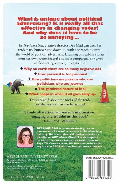 What is unique about political advertising? Is it really all that effective in changing votes? And why does it have to be so annoying . In The Hard Sell, creative director Dee Madigan uses her trademark humour and down-to-earth approach to unveil the world of political advertising. Drawing on real-life stories from her own recent Federal and State campaigns, she gives us fascinating industry insight into: * How political ads are designed to work; * Who are they designed to work on; * How we pay for them; * Why we make so many negative ads; * How personal is too personal; * How spin works, particularly in an election campaigns; * How to make messages cut through the cynicism; * How politicians use journos who use politicians who use journos; * The gendered nature of it all; * And finally, what happens when it all turns to sh*t! Dee is candid about the tricks of the trade and the lessons that can be learnt.