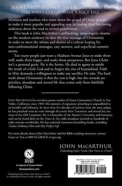 Jesus Christ did not die on the cross so you and I could have a nice day. Ministers and teachers who water down the gospel of Christ in order to make it more popular and appealing may be leading their fun-loving audiences down the road to eternal punishment. This book is John MacArthur's unflinching, unapologetic treatise on the modern tendency to alter the true message of Christianity in order to meet the whims and desires of a culture hoping for nonconfrontational messages, easy answers, and superficial commitments. Too many people just want a Madison Avenue Jesus to make them well, make them happy, and make them prosperous. But Jesus Christ isn't a personal genie. He is the Savior. He died in agony to satisfy the wrath of a holy God and to forgive the sins of humankind. Faith in Him demands a willingness to make any sacrifice He asks. The hard truth about Christianity is that the cost is high, but the rewards are priceless: abundant and eternal life that comes only from faithfully follwing Christ.