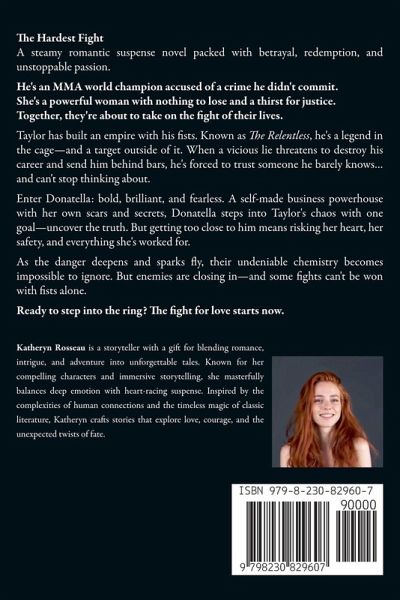 The Hardest Fight A steamy romantic suspense novel packed with betrayal, redemption, and unstoppable passion. He's an MMA world champion accused of a crime he didn't commit. She's a powerful woman with nothing to lose and a thirst for justice. Together, they're about to take on the fight of their lives. Taylor has built an empire with his fists. Known as The Relentless, he's a legend in the cage-and a target outside of it. When a vicious lie threatens to destroy his career and send him behind bars, he's forced to trust someone he barely knows... and can't stop thinking about. Enter Donatella: bold, brilliant, and fearless. A self-made business powerhouse with her own scars and secrets, Donatella steps into Taylor's chaos with one goal-uncover the truth. But getting too close to him means risking her heart, her safety, and everything she's worked for. As the danger deepens and sparks fly, their undeniable chemistry becomes impossible to ignore. But enemies are closing in-and some fights can't be won with fists alone. Ready to step into the ring? The fight for love starts now.