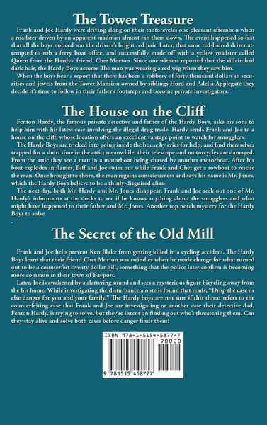 The Tower Treasure Frank and Joe Hardy were driving along on their motorcycles one pleasant afternoon when a roadster driven by an apparent madman almost ran them down. The event happened so fast that all the boys noticed was the drivers' bright red hair. Later, that same red-haired driver attempted to rob a ferry boat office, and successfully made off with a yellow roadster called Queen from the Hardys' friend, Chet Morton. Since one witness reported that the villain had dark hair, the Hardy Boys assume The man was wearing a red wig when they saw him. When the boys hear a report that there has been a robbery of forty thousand dollars in securities and jewels from the Tower Mansion owned by siblings Hurd and Adelia Applegate they decide it's time to follow in their father's footsteps and become private investigators. The House on the Cliff Fenton Hardy, the famous private detective and father of the Hardy Boys, asks his sons to help him with his latest case involving the illegal drug trade. Hardy sends Frank and Joe to a house on the cliff, whose location offers an excellent vantage point to watch for smugglers. The Hardy Boys are tricked into going inside the house by cries for help, and find themselves trapped for a short time in the attic; meanwhile, their telescope and motorcycles are damaged. From the attic they see a man in a motorboat being chased by another motorboat. After his boat explodes in flames, Biff and Joe swim out while Frank and Chet get a rowboat to rescue the man. Once brought to shore, the man regains consciousness and says his name is Mr. Jones, which the Hardy Boys believe to be a thinly-disguised alias. The next day, both Mr. Hardy and Mr. Jones disappear. Frank and Joe seek out one of Mr. Hardy's informants at the docks to see if he knows anything about the smugglers and what might have happened to their father and Mr. Jones. Another top notch mystery for the Hardy Boys to solve. The Secret of the Old Mill Frank and Joe help prevent Ken Blake from getting killed in a cycling accident. The Hardy Boys learn that their friend Chet Morton was swindles when he made change for what turned out to be a counterfeit twenty dollar bill, something that the police later confirm is becoming more common in their town of Bayport. Later, Joe is awakened by a clattering sound and sees a mysterious figure bicycling away from the his home. While investigating the disturbance a note is found that reads, "Drop the case or else danger for you and your family." The Hardy boys are not sure if this threat refers to the counterfeiting case that Frank and Joe are investigating or another case their detective dad, Fenton Hardy, is trying to solve, but they're intent on finding out who's threatening them. Can they stay alive and solve both cases before danger finds them?