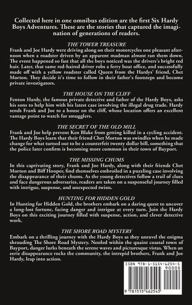 Collected here in one omnibus edition are the first six Hardy Boys Adventures. These are the thrilling stories that captured the imagination of generations of readers. THE TOWER TREASURE Frank and Joe Hardy were driving along on their motorcycles one pleasant afternoon when a roadster driven by an apparent madman almost ran them down. The event happened so fast that all the boys noticed was the drivers' bright red hair. Later, that same red-haired driver robs a ferry boat office, and successfully made off with a yellow roadster called Queen from the Hardys' friend, Chet Morton. They decide it's time to follow in their father's footsteps and become private investigators. THE HOUSE ON THE CLIFF Fenton Hardy, the famous private detective and father of the Hardy Boys, asks his sons to help him with his latest case involving the illegal drug trade. Hardy sends Frank and Joe to a house on the cliff, whose location offers an excellent vantage point to watch for smugglers. THE SECRET OF THE OLD MILL Frank and Joe help prevent Ken Blake from getting killed in a cycling accident. The Hardy Boys learn that their friend Chet Morton was swindles when he made change for what turned out to be a counterfeit twenty dollar bill, something that the police later confirm is becoming more common in their town of Bayport. THE MISSING CHUMS In this captivating story, Frank and Joe Hardy, along with their friends Chet Morton and Biff Hooper, find themselves embroiled in a puzzling case involving the disappearance of their chums. As the young detectives follow a trail of clues and face dangerous adversaries, readers are taken on a suspenseful journey filled with intrigue, suspense, and unexpected twists. HUNTING FOR HIDDEN GOLD In Hunting for Hidden Gold, the brothers embark on a daring quest to uncover a long-lost fortune, facing danger and intrigue at every turn. Join the Hardy Boys on this exciting journey filled with suspense, action, and clever detective work. THE SHORE ROAD MYSTERY Embark on a thrilling journey with the Hardy Boys as they unravel the enigma shrouding The Shore Road Mystery. Nestled within the quaint coastal town of Bayport, danger lurks beneath the serene waves and picturesque vistas. When an eerie disappearance rocks the community, the intrepid brothers, Frank and Joe Hardy, leap into action.