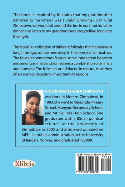 This book is inspired by folktales that my grandmother narrated to me when I was a child. Growing up in rural Zimbabwe, we would sit around the fire in our mud hut after dinner and listen to my grandmother’s storytelling long into the night. This book is a collection of different folktales that happened a long time ago, somewhere deep in the forests of Zimbabwe. The folktales sometimes feature some interaction between and among animals and sometimes a combination of animals and humans. The folktales are didactic in nature, thus they often end up depicting important life lessons.