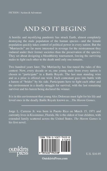 A horrific and mystifying pandemic has struck Earth, almost completely destroying the male population of the human species-and the female population quickly takes control of political power in every nation. But the "Matriarchs" are far more interested in revenge for the mistreatment they endured under their former societies than the preservation of the species. They set about designing a bloodthirsty tournament, forcing the surviving males to fight each other to the death until only one remains. Two hundred years later, The Matriarchy has fine-tuned the rules of this contest: Now, every decade or so, one young male from every nation is chosen to "participate" in a Battle Royale. The last man standing wins and as a prize is offered one wish. Each contestant goes into battle with a harem of "brides" by his side. Participants have to fight each other and the environment in a deadly struggle for survival, with the last remaining survivor and his harem being declared the winner. It is in this environment that young Alex Dolorean must fight for his life and loved ones in the deadly Battle Royale known as...The Harem Games. (Not recommended for young children.)