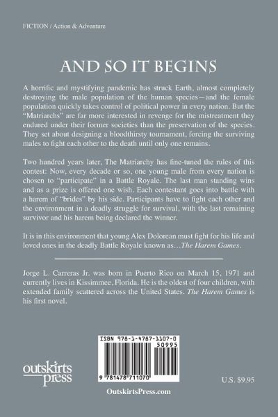 A horrific and mystifying pandemic has struck Earth, almost completely destroying the male population of the human species-and the female population quickly takes control of political power in every nation. But the "Matriarchs" are far more interested in revenge for the mistreatment they endured under their former societies than the preservation of the species. They set about designing a bloodthirsty tournament, forcing the surviving males to fight each other to the death until only one remains. Two hundred years later, The Matriarchy has fine-tuned the rules of this contest: Now, every decade or so, one young male from every nation is chosen to "participate" in a Battle Royale. The last man standing wins and as a prize is offered one wish. Each contestant goes into battle with a harem of "brides" by his side. Participants have to fight each other and the environment in a deadly struggle for survival, with the last remaining survivor and his harem being declared the winner. It is in this environment that young Alex Dolorean must fight for his life and loved ones in the deadly Battle Royale known as...The Harem Games. (Not recommended for young children.)