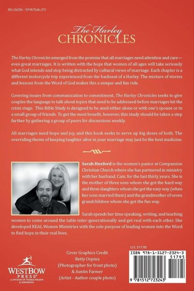 The Harley Chronicles emerged from the premise that all marriages need attention and care-even great marriages. It is written with the hope that women of all ages will take seriously what God intends and stop being distracted by cultural views of marriage. Each chapter is a different motorcycle trip experienced from the backseat of a Harley. The mixture of stories and lessons from the Word of God makes this a unique and fun ride. Covering issues from communication to commitment, The Harley Chronicles seeks to give couples the language to talk about topics that need to be addressed before marriages hit the crisis stage. This Bible Study is designed to be used either alone or with one's spouse or in a small group of friends. To get the most benefit, however, this study should be taken a step further by gathering a group of peers for discussions weekly. All marriages need hope and joy, and this book seeks to serve up big doses of both. The overriding theme of keeping laughter alive in your marriage may just be the best medicine.