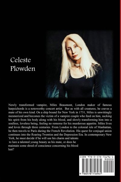 Newly transformed vampire, Miles Beaumont, London maker of famous harpsichords is a noteworthy concert artist. But as with all creatures, he craves a mate of his own kind. On a ship bound for New York in 1731, Miles is unwittingly mesmerized and becomes the victim of a vampire couple who feed on him, sucking his spirit from his body along with his blood, and slowly transforming him into a soulless, loveless being, feeling no remorse for his murderous appetite. Miles lives and loves through three centuries. From London to the colonial isle of Manhattan, he then travels to Paris during the French Revolution. His quest for conjugal union continues into the Roaring Twenties and the Depression Era. In contemporary New York, he must decide - should he use his charm and talents to lure a talented young beauty as his mate or maintain some shred of conscience concerning his blood lust?