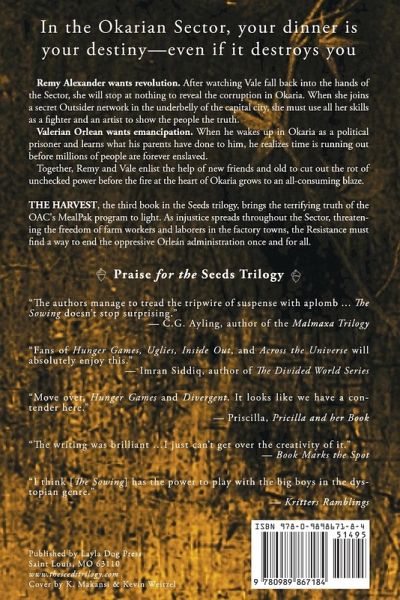 Remy Alexander wants revolution. After watching Vale fall back into the hands of the Sector, she will stop at nothing to reveal the corruption in Okaria. When she joins a secret Outsider network in the underbelly of the capital city, she must use all her skills as a fighter and an artist to show the people the truth. Valerian Orlean wants emancipation. When he wakes up in Okaria as a political prisoner and learns what his parents have done to him, he realizes time is running out before millions of people are forever enslaved. Together, Remy and Vale enlist the help of new friends and old to cut out the rot of unchecked power before the fire at the heart of Okaria grows to an all-consuming blaze. THE HARVEST, the third book in the Seeds trilogy, brings the terrifying truth of the OAC's MealPak program to light. As injustice spreads throughout the Sector, threatening the freedom of farm workers and laborers in the factory towns, the Resistance must find a way to end the oppressive Orleán administration once and for all.