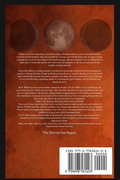 Colleen Carter has everything: a successful career, a devoted husband, and two beautiful children. Until her fortieth birthday, when she is visited by a strange and God-like being. His message is simple: a bargain was struck by the women in her family long ago. She can continue to live her blessed life for many years to come and sacrifice her twelve-year-old daughter, or she can sacrifice herself. But tonight, someone must die. Darrel Ray Miller is a simple preacher, traveling the countryside with his tent revival, bringing the gospel to everyone he meets. People are flocking from all over to hear his message of love and family, and to witness the miracles that seem to happen every night. But even as true as he is to his message of love and fellowship, something sinister is corrupting his joyful ministry, and his followers are paying the price. M.M. Wildes has many secrets hidden behind the facade of M. M. Wildes' Tarot and Beyond, the occult shop she runs with her partner Sugar. Her real name, the name of a girl long dead, sacrificed as part of a great bargain. Her real face, hiding behind a magical glamour, ever-shifting, ever-changing. Her real mission, to protect the innocent of the world at all costs. Even if it means giving up her own life, or the only chance she may ever have at true happiness. Most of all, she keeps the secret of her home and family. Now, a new threat is growing in the world, a powerful enemy is stalking the sisters and brothers of Mercer. Witches and their consorts are dying, and young people, marked to one day join the magical Mercer family, are disappearing without a trace. The ways of the magical world are changing, and the definitions of good and evil are becoming blurry. M. M. Wildes, along with her family, those bound by both magic and blood, must uncover who is behind the peril to her magical home, while she fights to protect those people most important to them. Magic and might, faith, love, duty, and family, all of these will be tested beyond their limits as one thing becomes clearer every day. The Harvest has begun.