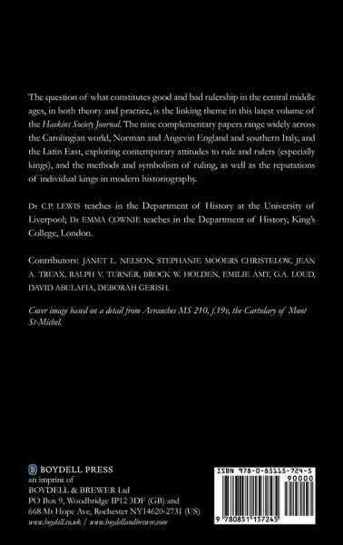 The question of what constitutes good and bad rulership in the central middle ages, in both theory and practice, is the linking theme in this latest volume of the 'Haskins Society Journal'. The nine complementary papers range widely across the Carolingian world, Norman and Angevin England and southern Italy, and the Latin East, exploring contemporary attitudes to rule and rulers (especially kings), and the methods and symbolism of ruling, as well as the reputations of individual kings in modern historiography. Dr C.P. LEWIS teaches in the Department of History at the University of Liverpool; Dr EMMA COWNIE teaches in the Department of History, King's College, London. Contributors: JANET L. NELSON, STEPHANIE MOOERS CHRISTELOW, JEAN A. TRUAX, RALPH V. TURNER, BROCK W. HOLDEN, EMILIE AMT, G.A. LOUD, DAVID ABULAFIA, DEBORAH GERISH