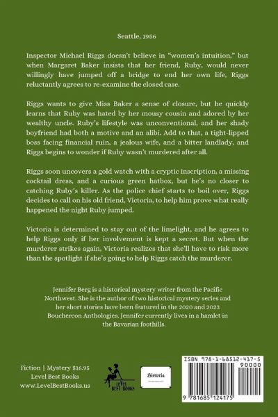 Seattle, 1956 Inspector Michael Riggs doesn't believe in "women's intuition," but when Margaret Baker insists that her friend, Ruby, would never willingly have jumped off a bridge to end her own life, Riggs reluctantly agrees to re-examine the closed case. Riggs wants to give Miss Baker a sense of closure, but he quickly learns that Ruby was hated by her mousy cousin and adored by her wealthy uncle. Ruby's lifestyle was unconventional, and her shady boyfriend had both a motive and an alibi. Add to that, a tight-lipped boss facing financial ruin, a jealous wife, and a bitter landlady, and Riggs begins to wonder if Ruby wasn't murdered after all. Riggs soon uncovers a gold watch with a cryptic inscription, a missing cocktail dress, and a curious green hatbox, but he's no closer to catching Ruby's killer. As the police chief starts to boil over, Riggs decides to call on his old friend, Victoria, to help him prove what really happened the night Ruby jumped. Victoria is determined to stay out of the limelight, and he agrees to help Riggs only if her involvement is kept a secret. But when the murderer strikes again, Victoria realizes that she'll have to risk more than the spotlight if she's going to help Riggs catch the murderer.