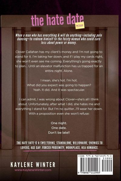 When a man who has everything & will do anything-including pole dancing-to redeem himself to the feisty woman who couldn't care less about power or money. Clover Callahan has my client's money and I'm not going to stand for it. I'm taking her down, and if I play my cards right, she won't even see me coming. Everything's going exactly to plan... Until an elevator malfunction has us trapped for an entire night. Alone. I mean, she's hot. I'm hot. What did you expect was going to happen? Yeah. It did. And it was spectacular. I can admit, I was wrong about Clover-she's all I think about. Unfortunately, after what I did, she hates me and everything I stand for. But I'm no quitter...I'll wear her down. With a proposition even she won't refuse: One night. One date. Don't be late!! The Hate Date is a sweltering, standalone, billionaire, enemies to lovers, age gap, forced proximity, workplace, HEA romance.