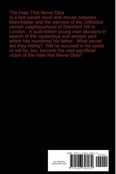 The Hate That Never Dies Is a fast paced novel and moves between Manchester and the warrens of the Orthodox Jewish neighbourhood of Stamford Hill in London. A guilt-ridden young man blunders in search of the mysterious and ancient sect which has murdered his father. What secret are they hiding? Will he succeed in his quest or will he, too, become the next sacrificial victim of the Hate that Never Dies?