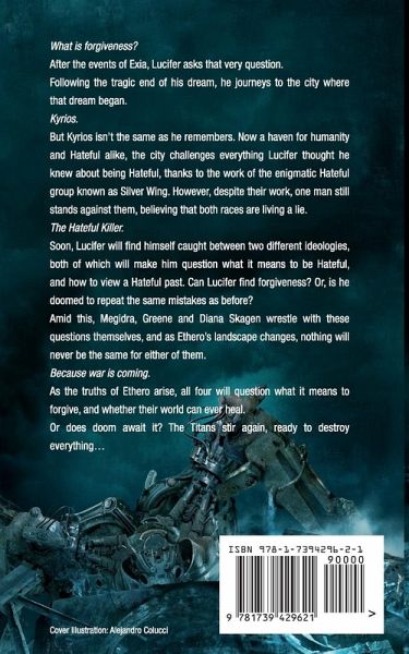 What is forgiveness? After the events of Exia, Lucifer asks that very question. Following the tragic end of his dream, he journeys to the city where that dream began. Kyrios. But Kyrios isn't the same as he remembers. Now a haven for humanity and Hateful alike, the city challenges everything Lucifer thought he knew about being Hateful, thanks to the work of the enigmatic Hateful group known as Silver Wing. However, despite their work, one man still stands against them, believing that both races are living a lie. The Hateful Killer. Soon, Lucifer will find himself caught between two different ideologies, both of which will make him question what it means to be Hateful, and how to view a Hateful past. Can Lucifer find forgiveness? Or, is he doomed to repeat the same mistakes as before? Amid this, Megidra, Greene and Diana Skagen wrestle with these questions themselves, and as Ethero's landscape changes, nothing will never be the same for either of them. Because war is coming. As the truths of Ethero arise, all four will question what it means to forgive, and whether their world can ever heal. Or does doom await it? The Titans stir again, ready to destroy everything...