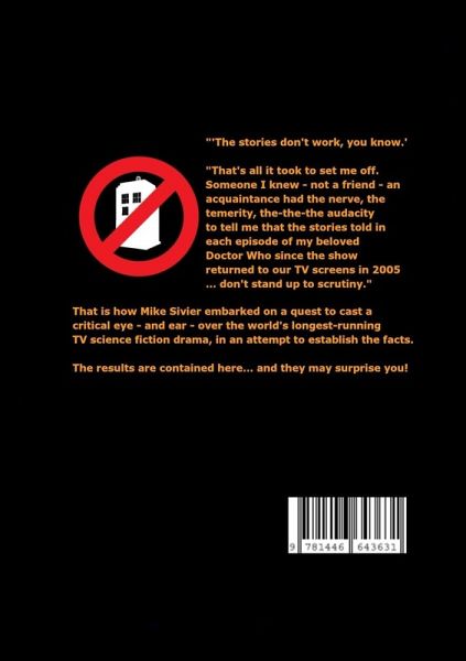 "'The stories don't work, you know.' "That's all it took to set me off. Someone I knew - not a friend - an acquaintance had the nerve, the temerity, the-the-the audacity to tell me that the stories told in each episode of my beloved Doctor Who since the show returned to our TV screens in 2005 ... don't stand up to scrutiny." That is how Mike Sivier embarked on a quest to cast a critical eye - and ear - over the world's longest-running TV science fiction drama, in an attempt to establish the facts. The results are contained here... and they may surprise you!