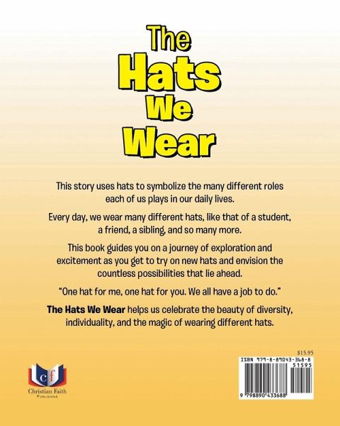 This story uses hats to symbolize the many different roles each of us plays in our daily lives. Every day, we wear many different hats, like that of a student, a friend, a sibling, and so many more. This book guides you on a journey of exploration and excitement as you get to try on new hats and envision the countless possibilities that lie ahead. "One hat for me, one hat for you. We all have a job to do." The Hats We Wear helps us celebrate the beauty of diversity, individuality, and the magic of wearing different hats.