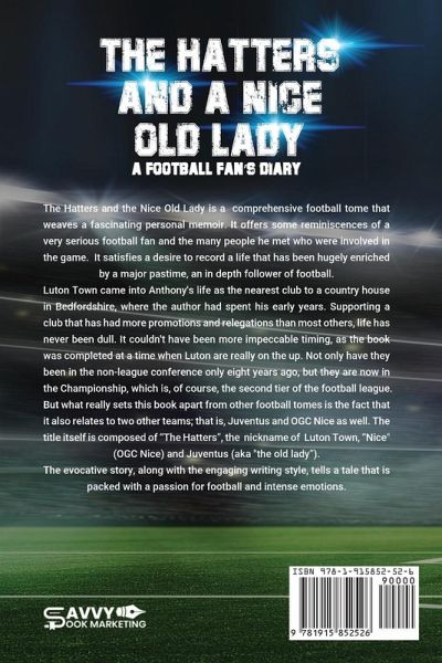 The Hatters and the Nice Old Lady is a comprehensive football tome that weaves a fascinating personal memoir. It offers some reminiscences of a very serious football fan and the many people he met who were involved in the game. It satisfies a desire to record a life that has been hugely enriched by a major pastime, an in depth follower of football. Luton Town came into Anthony's life as the nearest club to a country house in Bedfordshire, where the author had spent his early years. Supporting a club that has had more promotions and relegations than most others, life has never been dull. It couldn't have been more impeccable timing, as the book was completed at a time when Luton are really on the up. Not only have they been in the non-league conference only eight years ago, but they are now in the Championship, which is, of course, the second tier of the football league. But what really sets this book apart from other football tomes is the fact that it also relates to two other teams; that is, Juventus and OGC Nice as well. The title itself is composed of "The Hatters", the nickname of Luton Town, "Nice" (OGC Nice) and Juventus (aka "the old lady"). The evocative story, along with the engaging writing style, tells a tale that is packed with a passion for football and intense emotions.