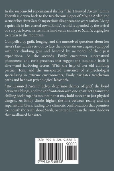 In the suspenseful supernatural thriller "The Haunted Ascent," Emily Forsyth is drawn back to the treacherous slopes of Mount Arden, the scene of her sister Sarah's mysterious disappearance years earlier. Living a quiet life in her coastal town, Emily's world is upended by the arrival of a cryptic letter, written in a hand eerily similar to Sarah's, urging her to return to the mountain. Compelled by guilt, longing, and the unresolved questions about her sister's fate, Emily sets out to face the mountain once again, equipped with her climbing gear and haunted by memories of their past expeditions. As she ascends, Emily encounters supernatural phenomena and eerie presences that suggest the mountain itself is alive-and harboring secrets. With the help of her old climbing partner Tom, and the unexpected assistance of a psychologist specializing in extreme environments, Emily navigates treacherous paths and her own psychological labyrinth. "The Haunted Ascent" delves deep into themes of grief, the bond between siblings, and the confrontation with one's past, set against the chilling backdrop of a mountain that may hold more than just physical dangers. As Emily climbs higher, the line between reality and the supernatural blurs, leading to a climactic confrontation that promises to unearth the truth about Sarah, or entrap Emily in the same shadows that swallowed her sister.