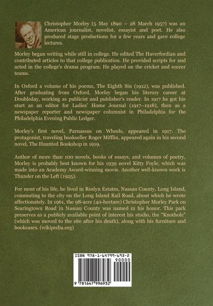Christopher Morley (5 May 1890 - 28 March 1957) was an American journalist, novelist, essayist and poet. He also produced stage productions for a few years and gave college lectures. Morley began writing while still in college. He edited The Haverfordian and contributed articles to that college publication. He provided scripts for and acted in the college's drama program. He played on the cricket and soccer teams. In Oxford a volume of his poems, The Eighth Sin (1912), was published. After graduating from Oxford, Morley began his literary career at Doubleday, working as publicist and publisher's reader. In 1917 he got his start as an editor for Ladies' Home Journal (1917-1918), then as a newspaper reporter and newspaper columnist in Philadelphia for the Philadelphia Evening Public Ledger. Morley's first novel, Parnassus on Wheels, appeared in 1917. The protagonist, traveling bookseller Roger Mifflin, appeared again in his second novel, The Haunted Bookshop in 1919. He was one of the founders and a longtime contributing editor of the Saturday Review of Literature. A highly gregarious man, he was the mainstay of what he dubbed the "Three Hours for Lunch Club". Out of enthusiasm for the Sherlock Holmes stories, he helped found The Baker Street Irregulars and wrote the introduction to the standard omnibus edition of The Complete Sherlock Holmes. He also wrote an introduction to the standard omnibus edition of The Complete Works of Shakespeare in 1936, although Morley called it an "Introduction to Yourself as a Reader of Shakespeare". That year, he was appointed to revise and enlarge Bartlett's Familiar Quotations (11th edition in 1937 and 12th edition in 1948). He was one of the first judges for the Book of the Month Club, serving in that position until the early 1950s. Author of more than 100 novels, books of essays, and volumes of poetry, Morley is probably best known for his 1939 novel Kitty Foyle, which was made into an Academy Award-winning movie. Another well-known work is Thunder on the Left (1925). For most of his life, he lived in Roslyn Estates, Nassau County, Long Island, commuting to the city on the Long Island Rail Road, about which he wrote affectionately. In 1961, the 98-acre (40-hectare) Christopher Morley Park on Searingtown Road in Nassau County was named in his honor. This park preserves as a publicly available point of interest his studio, the "Knothole" (which was moved to the site after his death), along with his furniture and bookcases. (wikipedia.org)