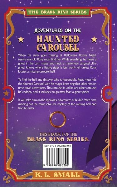 SPOOKY ADVENTURES ON THE HAUNTED CAROUSEL When his sister goes missing at Halloween Horror Night, twelve-year-old Rusty must find her. While searching, he meets a ghost in the corn maze and finds a mysterious carousel. The ghost knows where Rusty's sister is but won't tell unless Rusty locates a missing carousel bell. To find the bell and discover who is responsible, Rusty must ride the Haunted Carousel with his magic brass ring that takes him on time travel adventures. This carousel is unlike any other carousel he's ridden, and it includes his greatest fear: a giant spider. It will take him on the spookiest adventures of his life. With time running out, he must solve the mystery of the missing bell and find his sister.