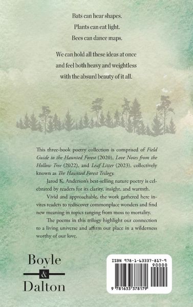Bats can hear shapes. Plants can eat light. Bees can dance maps. We can hold all these ideas at once and feel both heavy and weightless with the absurd beauty of it all. This three-book poetry collection is comprised of Field Guide to the Haunted Forest (2020), Love Notes from the Hollow Tree (2022), and Leaf Litter (2023), collectively known as The Haunted Forest Trilogy. Jarod K. Anderson's best-selling nature poetry is celebrated by readers for its clarity, insight, and warmth. Vivid and approachable, the work gathered here invites readers to rediscover commonplace wonders and find new meaning in topics ranging from moss to mortality. The poems in this trilogy highlight our connection to a living universe and affirm our place in a wilderness worthy of our love.