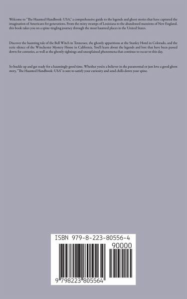 Welcome to "The Haunted Handbook: USA," a comprehensive guide to the legends and ghost stories that have captured the imagination of Americans for generations. From the misty swamps of Louisiana to the abandoned mansions of New England, this book takes you on a spine-tingling journey through the most haunted places in the United States. Discover the haunting tale of the Bell Witch in Tennessee, the ghostly apparitions at the Stanley Hotel in Colorado, and the eerie silence of the Winchester Mystery House in California. You'll learn about the legends and lore that have been passed down for centuries, as well as the ghostly sightings and unexplained phenomena that continue to occur to this day. So buckle up and get ready for a hauntingly good time. Whether you're a believer in the paranormal or just love a good ghost story, "The Haunted Handbook: USA" is sure to satisfy your curiosity and send chills down your spine.