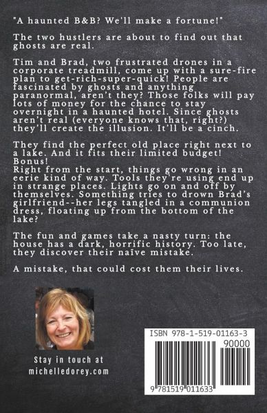 "A haunted B&B? We'll make a fortune!" The two hustlers are about to find out that ghosts are real. Tim and Brad, two frustrated drones in a corporate treadmill, come up with a sure-fire plan to get-rich-super-quick! People are fascinated by ghosts and anything paranormal, aren't they? Those folks will pay lots of money for the chance to stay overnight in a haunted hotel. Since ghosts aren't real (everyone knows that, right?) they'll create the illusion. It'll be a cinch. They find the perfect old place right next to a lake. And it fits their limited budget! Bonus! Right from the start, things go wrong in an eerie kind of way. Tools they're using end up in strange places. Lights go on and off by themselves. Something tries to drown Brad's girlfriend--her legs tangled in a communion dress, floating up from the bottom of the lake? The fun and games take a nasty turn. The house has a dark, horrific history. Too late, they discover their naïve mistake. A mistake, that could cost them their lives.