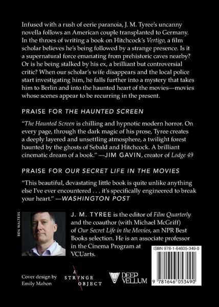 "Informed by the eerie paranoia of horror film, J.M. Tyree's uncanny novella follows a couple transplanted to Germany. While in the throes of writing a book on Hitchcock's Vertigo, a film scholar believes he's being followed by a strange presence. Is this a supernatural force emanating from the prehistoric caves in the region, one captured in lost footage from horror movies filmed in the area in the 1920s? Or is he being stalked by his ex, a mentor, former lover, and brilliant but problematic critic who claims to have discovered the secret history of a supernatural camera used in films by Murnau and Hitchcock? When our scholar's wife disappears and the local police start investigating him, he attempts to unravel a mystery that takes him to Berlin, to Prague, and into the haunted heart of movies whose scenes appear to be recurring in the present. Moving between the double- life of professional networking and obsessive unease, The Haunted Screen blends the madness and obsession of academia with a dark, thrilling current of psychological mystery"--