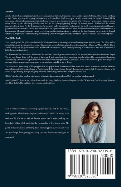 Synopsis: Amelia inherits her estranged grandmother's decaying gothic mansion, Blackwood Manor, and a legacy of chilling whispers and terrifying secrets. Drawn by a morbid curiosity and a desire to understand her family's dark past, Amelia ventures into the manor's shadowed halls, uncovering a history of tragic deaths, dark rituals, and restless spirits. She discovers a series of cryptic clues - a mysterious locket, a hidden room, a bone key, and a haunting melody - that lead her on a terrifying journey through the manor's hidden chambers and the haunted cemetery of Lost Souls. As she delves deeper, she confronts malevolent entities and uncovers the truth behind a generations-old curse, a pact made with a dark force. Amelia must not only face the supernatural terrors that haunt Blackwood Manor but also confront the sins of her ancestors. Ultimately, she must choose between succumbing to the darkness or embracing the light, breaking the cycle of evil through repentance, forgiveness, and the enduring power of hope, transforming Blackwood Manor from a place of fear into a sanctuary of peace. Part Of The Book: Rain lashed against the gothic windows of the Blackwood Manor, mirroring the storm brewing inside Amelia's heart. The telegram had arrived that morning, stark and impersonal: "Grandmother deceased. Estate to beneficiary. Attend probate - Blackwood Manor, Hollow Creek." Amelia hadn't seen her grandmother, Elara Blackwood, since she was a child, a fleeting memory of a stern woman with eyes that seemed to hold the secrets of centuries. The drive to Hollow Creek was a descent into the uncanny. Twisted, gnarled trees clawed at the roadside, their branches like skeletal fingers. The air grew heavy, thick with the scent of damp earth and something else... something metallic, almost like blood. As the Blackwood Manor finally came into view, perched atop a desolate hill overlooking the town, Amelia felt a shiver crawl down her spine. It wasn't just the ominous silhouette against the stormy sky; it was an almost palpable sense of dread. The house was a monstrosity of decaying grandeur. Gargoyles leered from the roof, their stone faces eroded by time and weather. The front door, a heavy oak affair, groaned open as Amelia pushed, the sound echoing through the cavernous entrance hall. Dust motes danced in the slivers of light filtering through the grimy windows, illuminating cobwebs that hung like macabre lace. "Hello?" Amelia called out, her voice a mere whisper in the oppressive silence. Only the howling wind answered. A sudden BANG from the back of the house made her jump. Her heart hammered against her ribs. "Who's there?" she demanded, her voice trembling slightly. She grabbed a heavy, ornate candlestick.......