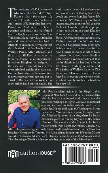 The hurricane of 1929 devastated Miami and affected Eveline Paine's plans for a new life in South Florida. Ransom letters and threats of kidnapping her sons, Patrick and Andrew, led Eveline to gangsters and situations that forced her to relive her previous life in New York State. Many individuals from her past and present had been involved in attempts to undermine her wealth that she inherited from her late husband, Wallace Paine. After attempts and threats to kill Eveline, a detective from the Miami Police Department, Jonathon Bingham, is assigned to the case and proceeds to uncover more criminal activity than expected. Eveline had believed the corruption that was exposed years ago, and put to a trial in Rochester, New York, a few years earlier, had been concluded. She is still haunted by suspicious characters and circumstances that appear to be people and events from her former life in Geneva, NY. After many months of uncertainty, situations unfold causing Eveline to learn the truth about people in her past when she and Eleanor Roosevelt share lunch at the Biltmore Hotel. After learning new information, Eveline is forced to rethink and face what had happened many years ago. Being concerned about her future now, because everyone is either dead, in prison, or moved away, Eveline suffers from a recurring ailment that has implications for her future. From The House of Many Windows and The Spirit of Wallace Paine to The Haunting of Eveline Paine, Eveline is forced to overcome unbelievable odds which ultimately give her the freedom for a new life.