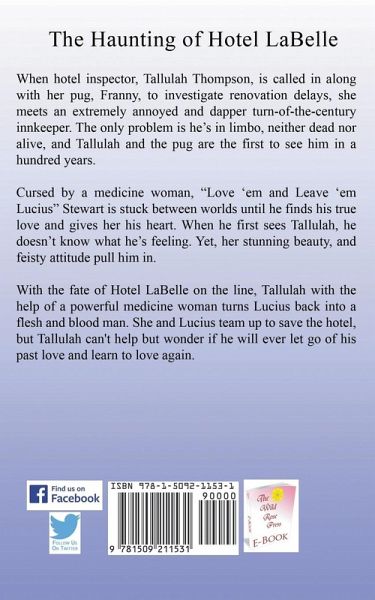 When hotel inspector, Tallulah Thompson, is called in along with her pug, Franny, to investigate renovation delays, she meets an extremely annoyed and dapper turn-of-the-century innkeeper. The only problem is he’s in limbo, neither dead nor alive, and Tallulah and the pug are the first to see him in a hundred years. Cursed by a medicine woman, "Love ‘em and Leave ‘em Lucius" Stewart is stuck between worlds until he finds his true love and gives her his heart. When he first sees Tallulah, he doesn’t know what he’s feeling. Yet, her stunning beauty, and feisty attitude pull him in. With the fate of Hotel LaBelle on the line, Tallulah with the help of a powerful medicine woman turns Lucius back into a flesh and blood man. She and Lucius team up to save the hotel, but Tallulah can't help but wonder if he will ever let go of his past love and learn to love again.
