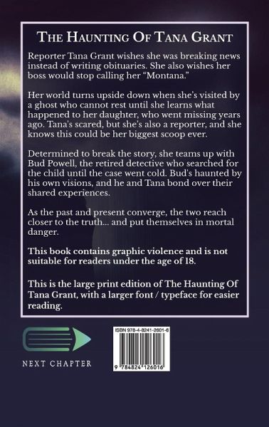 Reporter Tana Grant wishes she was breaking news instead of writing obituaries. She also wishes her boss would stop calling her "Montana." Her world turns upside down when she's visited by a ghost who cannot rest until she learns what happened to her daughter, who went missing years ago. Tana's scared, but she's also a reporter, and she knows this could be her biggest scoop ever. Determined to break the story, she teams up with Bud Powell, the retired detective who searched for the child until the case went cold. Bud's haunted by his own visions, and he and Tana bond over their shared experiences. As the past and present converge, the two reach closer to the truth... and put themselves in mortal danger. This book contains graphic violence and is not suitable for readers under the age of 18. This is the large print edition of The Haunting Of Tana Grant, with a larger font / typeface for easier reading.