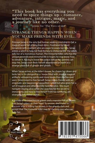Princess Serap is the only frail human seeking courtship in Qaf, a magical world full of long-lived djinn. Frustrated by failed romances with courtiers who are eager to usurp her title, Serap enlists a witch to help her find the key to immortal life. The witch tells her of a monstrous human, The Immortal Killer, who has the unique power to end immortal life in hopes he may know how to obtain it. Racing to leave the palace before her parents can stop her, Serap soon finds herself abandoned on earth in a strange place full of ghouls and ghosts. When Serap arrives at the killer's house, he chases her down and locks her in his dungeon in a house filled with strange magical artifacts, whispering spirits and more books than she has ever seen. Determined to free herself, Serap makes friends with an enigmatic and paranormal apparition called Evil who gives her a set of magical and other-worldly tasks to solve. She must navigate staying alive while she searches for the secret to immortality and how to free herself from her terrifying, yet strangely befuddled captor. A parade of haunted house guests and a mansion full of secrets turn Serap's plans on their head. To survive, she'll have to discover who is telling her secrets in the ghastly dark and accept that The Immortal Killer may be the only one who can help her.