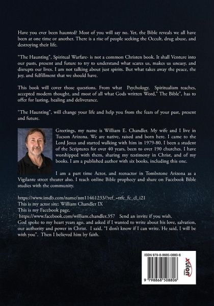 Have you ever been haunted? Most of you will say no. Yet, the Bible reveals we all have been at one time or another. There is a rise of people seeking the Occult, drug abuse, and destroying their life. "The Haunting", Spiritual Warfare- is not a common Christen book. It shall Venture into our pasts, present and future to try to understand what scares us, makes us uneasy, and disrupts our lives. I am not talking about just spirits. But what takes away the peace, the joy, and fulfillment that we should have. This book will cover those questions. From what Psychology, Spiritualism teaches, accepted modern thought, and most of all what Gods written Word," The Bible", has to offer for lasting, healing and deliverance. "The Haunting", will change your life and help you from the fears of your past, present and future. Greetings, my name is William E. Chandler. My wife and I live in Tucson Arizona. We are native, raised and born here. I came to the Lord Jesus and started walking with him in 1979-80. I been a student of the Scriptures for over 40 years, been to over 190 churches. I have worshipped with them, sharing my testimony in Christ, and of my books. I am a published author with six books, including this one. I am a part time Actor, and reenactor in Tombstone Arizona as a Vigilante street theater also. I teach online Bible prophecy and share on Facebook Bible studies with the community. https: //www.imdb.com/name/nm11461233/?ref_=ttfc_fc_cl_i21 This is my actor site: William Chandler IX This is my Facebook page. https: //www.facebook.com/william.chandler.357 Send an invite if you wish. God spoke to my heart years ago, and asked if I wanted to write about his love, salvation, our authority and power in Christ. I said, "I don't know if I can write. He said, I will be with you". Then I believed him by faith.