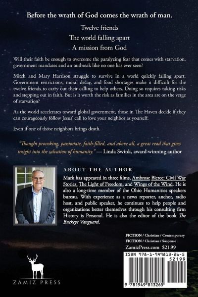 Twelve friends The world falling apart A mission from God Will their faith be enough to overcome the paralyzing fear that comes with starvation, government mandates and an outbreak like no one has ever seen? Mitch and Mary Harrison, struggle to survive in a world quickly falling apart. Government restrictions, moral decay, and food shortages make it difficult for the twelve friends to carry out their calling to help others. Doing so requires taking risks and stepping out in faith. But is it worth the risk as families in the area are on the verge of starvation? As the world accelerates toward global government, those in The Haven decide if they can courageously follow Jesus' call to love your neighbor as yourself. Even if one of those neighbors brings death.