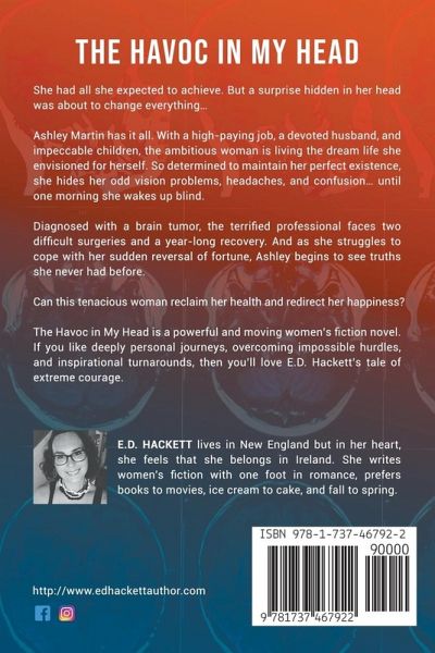 She had all she expected to achieve. But a surprise hidden in her head was about to change everything... Ashley Martin has it all. With a high-paying job, a devoted husband, and impeccable children, the ambitious woman is living the dream life she envisioned for herself. So determined to maintain her perfect existence, she hides her odd vision problems, headaches, and confusion... until one morning she wakes up blind. Diagnosed with a brain tumor, the terrified professional faces two difficult surgeries and a year-long recovery. And as she struggles to cope with her sudden reversal of fortune, Ashley begins to see truths she never had before. Can this tenacious woman reclaim her health and redirect her happiness? The Havoc in My Head is a powerful and moving women's fiction novel. If you like deeply personal journeys, overcoming impossible hurdles, and inspirational turnarounds, then you'll love E.D. Hackett's tale of extreme courage.