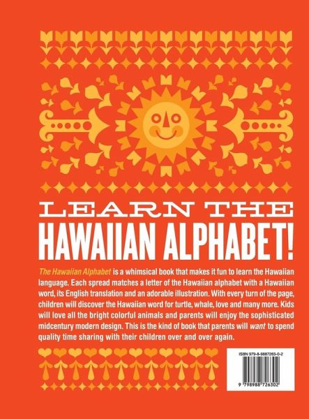 The Hawaiian Alphabet is a whimsical book that makes it fun for kids to learn the Hawaiian alphabet. Each spread matches a letter of the Hawaiian alphabet with a Hawaiian word, its English translation and an adorable illustration. With every turn of the page, children will discover the Hawaiian word for turtle, whale, love and many more. Kids will love all the bright colorful animals and parents will enjoy the sophisticated midcentury modern design. This is the kind of book that parents will want to spend quality time sharing with their children over and over again.