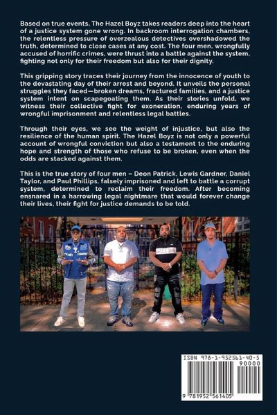 Based on true events, The Hazel Boyz takes readers deep into the heart of a justice system gone wrong. In backroom interrogation chambers, the relentless pressure of overzealous detectives overshadowed the truth, determined to close cases at any cost. The four men, wrongfully accused of horrific crimes, were thrust into a battle against the system, fighting not only for their freedom but also for their dignity. This gripping story traces their journey from the innocence of youth to the devastating day of their arrest and beyond. It unveils the personal struggles they faced-broken dreams, fractured families, and a justice system intent on scapegoating them. As their stories unfold, we witness their collective fight for exoneration, enduring years of wrongful imprisonment and relentless legal battles. Through their eyes, we see the weight of injustice, but also the resilience of the human spirit. The Hazel Boyz is not only a powerful account of wrongful conviction but also a testament to the enduring hope and strength of those who refuse to be broken, even when the odds are stacked against them. This is the true story of four men - Deon Patrick, Lewis Gardner, Daniel Taylor, and Paul Phillips, falsely imprisoned and left to battle a corrupt system, determined to reclaim their freedom. After becoming ensnared in a harrowing legal nightmare that would forever change their lives, their fight for justice demands to be told.