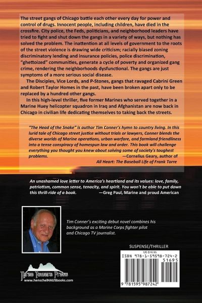 With The Head of the Snake, author Tim Conner picks up where Dirty Harry left off, but on steroids. Faced with endless gang violence and death in Chicago, a band of Marine veterans becomes the law. Their solution is Camp Keokuk in Iowa where vicious gang members disappear forever. Plucked off the mean streets, the worst of the worst are dropped by helicopter into permanent storage beyond redemption. While civil libertarians may howl, the daring conspiracy of revenge justice spreads and citizens applaud. Through fast-paced storytelling with characters that come vibrantly to life, Conner touches the third rail of urban policy, and sends a shock wave into the pious programs that have tried to deal with it so far. The Head of the Snake is an electrifying jolt to the solar plexus of our social consciousness. Dirty Harry would be proud.