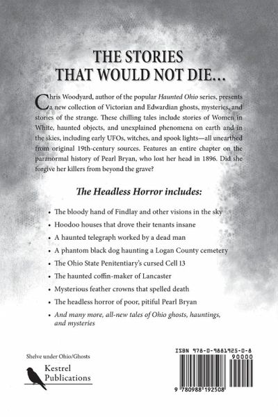 Chris Woodyard, author of the popular Haunted Ohio series, brings you the stories that would not die, with this collection of Victorian and Edwardian ghosts, mysteries, and tales of the strange. These chilling stories include reports of Women in White, haunted objects, and unexplained phenomena on earth and in the skies, including early UFOs, witches, and spook lights-all unearthed from original 19th-century sources. Features an entire chapter on the paranormal history of Pearl Bryan, who lost her head in 1896. Did she forgive her killers from beyond the grave? The Headless Horror includes: *The bloody hand of Findlay and other visions in the sky *Hoodoo houses that drove their tenants insane *A haunted telegraph worked by a dead man *A phantom black dog haunting a Logan County cemetery *The Ohio State Penitentiary's cursed Cell 13 *The Haunted coffin-maker of Lancaster *Mysterious feather crowns that spelled death *The headless horror of poor, pitiful Pearl Bryan *and many more, all-new tales of Ohio ghosts and hauntings.
