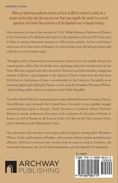How innocent he was in the summer of 1914. Philip Belmont, Professor of History at the University of California and expert on the diplomacy of Louis XVI had come in Paris to conduct historical research on 18th century politics. In love with France and in awe of its marvelous civilization, he arrived wide-eyed, full of expectation, and ready for a year of serious study. Through a series of interwoven circumstances, however, he was rapidly drawn into contemporary affairs that lured him into espionage and active involvement in the Great War that erupted soon after his arrival. Belmont’s activities include a dangerous mission to Rome—participation in the defense of Paris—work with the American Field Service Ambulance Corps—membership in the Lafayette Escadrille as an American fighter pilot flying for France—secret work for President Woodrow Wilson--and molding public opinion to support a free Polish Republic. Too often World War One is portrayed as a series of battles between Germany, France, Great Britain, and eventually the United States. In reality, it was a global struggle stretching from Japan to Europe, North America to Southern Africa. Professor Belmont’s travels underscore this point as he confronts the brutality of battle in France, as well in Russia on the Eastern Front, in Cairo on the Near Eastern Front, and in Salonika on the Macedonian Front. His adventures also intersect with major political figures, among them Woodrow Wilson, Lenin, and Lawrence of Arabia—plus various military leaders and diplomatic officials. Belmont’s activities also involve him in matters such as Zionism, the Armenian Massacres, the rise of Arab nationalism, and the Spanish Flu pandemic.