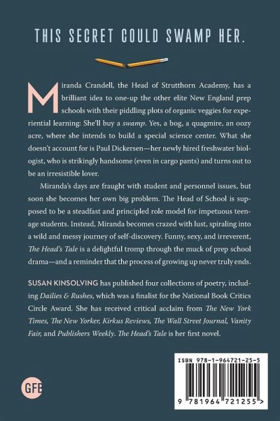 This secret could swamp her. Miranda Crandell, the Head of Strutthorn Academy, has a brilliant idea to one-up the other elite New England prep schools with their piddling plots of organic veggies for experiential learning: She'll buy a swamp. Yes, a bog, a quagmire, an oozy acre, where she intends to build a special science center. What she doesn't account for is Paul Dickersen, her newly hired freshwater biologist, who is strikingly handsome (even in cargo pants) and turns out to be an irresistible lover. Miranda's days are fraught with student and personnel issues, but soon she becomes her own big problem. The Head of School is supposed to be a steadfast and principled role model for impetuous teenage students. Instead, Miranda becomes crazed with lust, spiraling into a wild and messy journey of self-discovery. Funny, sexy, and irreverent, The Head's Tale is a delightful tromp through the muck of prep school drama . . . and a reminder that the process of growing up never truly ends.
