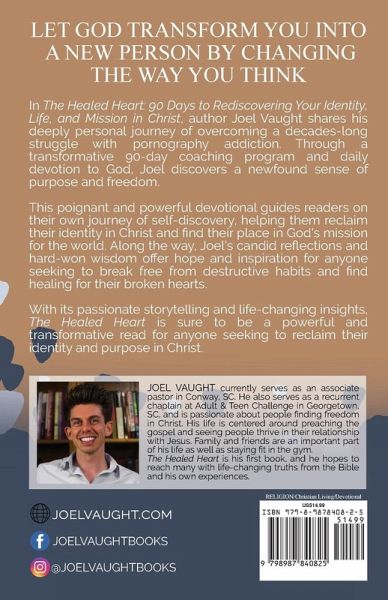 Reclaim your identity and purpose in Christ with The Healed Heart: 90 Days to Rediscovering Your Identity, Life, and Mission in Christ. In this poignant and powerful devotional, author Joel Vaught shares his deeply personal journey of overcoming a decades-long struggle with pornography addiction, offering readers a roadmap to reclaiming their identity in Christ and place in God's mission for the world. With its passionate storytelling and life-changing insights, The Healed Heart promises to be a powerful and transformative read, offering hope and inspiration to break free from destructive habits and find healing for your broken heart. What you will find inside: - A 90-day, easy-to-read devotional to reclaiming your identity and purpose in Christ - Inspirational and candid reflections from Joel's own journey of overcoming addiction - Powerful and life-changing insights that will help you find healing and hope Start your journey today! Sample Devotionals: Day 9: Before and After Eph. 6:11-12 "I used to be dead. I lived like the world and was led by my flesh and the devil. I pursued passionate desires. My will was bent towards every little impulse to fulfill my lust. I was filled with guilt, regret, and shame. I believed I was living, but I was a walking dead man. The good news is that God is filled with an abundance of kindness and mercy! He loved me even when I was against him. He loved me in my disobedience. Before I ever knew him, God made a way to give me life by sending Jesus to die for my rebellion and sins. He offered me his love and grace. Because I have accepted Jesus Christ as my Lord and Savior, I am no longer dead. I'm alive! I don't live for the flesh but after Christ and holiness. My will isn't bent towards lustful passions but towards God's supreme will. No longer am I filled with condemnation. Now I'm filled with freedom and peace. Before his grace entered my life, I was dead. Now, I am alive and united with Christ. Father, because I have received your grace, I have been transformed into a brand-new person.1 I am no longer dead. I have come to life! I'm not the man I was. You have changed my identity. So now, Holy Spirit, mold me into the man you have created me to be!" Day 23: Pleasing God 1 Thess. 2:4 "Who am I trying to please? Too often I am a people-pleaser. This isn't always a bad thing. I want my boss to be pleased with my work on the job. I want my future spouse to be pleased with me as we do life together. I want peace with my friends and family members, so I avoid conflict. The Apostle Paul essentially said, "Hey, we are boldly speaking about the Gospel whether people like it or receive it. We're not trying to get their approval. We're preaching because that is what God has called us to do." When pleasing others starts to hinder me from doing what God has called me to do, then there is a problem. I can't let the opinions and opposition of other people hinder me from living my life completely for God. I can't let the ideologies of the culture influence my decisions. I can't even let the approval of close family or friends curtail the work of God in my life. No, I live to please God; therefore, I will follow his leading in every area of my life no matter what! God, I like pleasing those around me, but I want to please you more! It can be difficult to go against the grain of my friends' or family's opinions, but if I'm walking with you, nothing else matters. Holy Spirit, give me the strength to be bold for you. You know what is best for me, so I choose to follow your leading everywhere. When a tough situation arises or a tough decision needs to be made, give me the wisdom I need. I surrender my life to you."